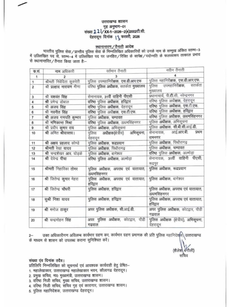 • पुलिस महकमे में बड़ा फेरबदल — एसएसपी देहरादून को हटाकर STF की जिम्मेदारी, प्रमेंद्र डोबाल को देहरादून और नवनीत भुल्लर को हरिद्वार की कमान